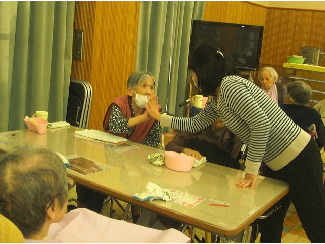 笑顔であいさつされる職員さんたちに、利用者さんも笑顔です。