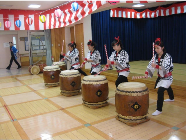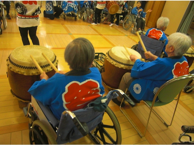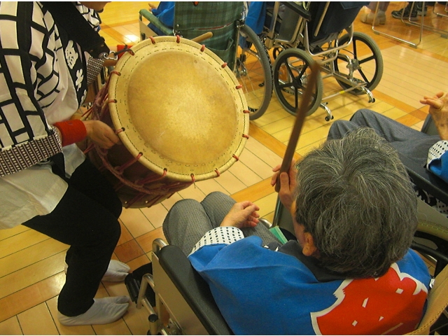 紅太鼓のみなさんの迫力のある演奏の後、利用者様も一緒に太鼓を叩かせて頂きました。