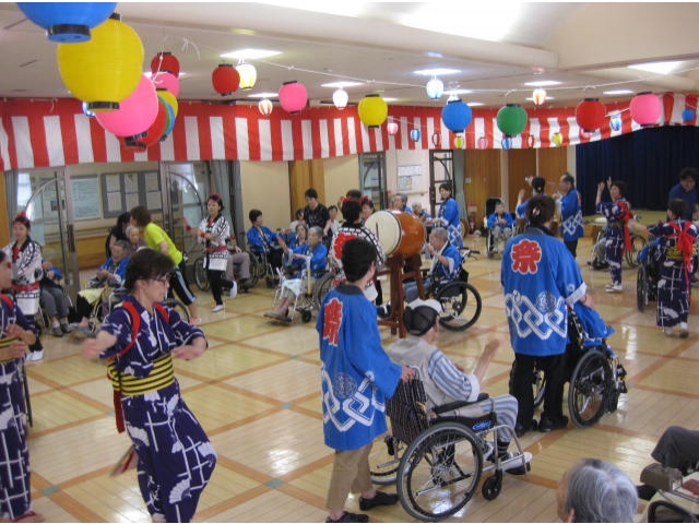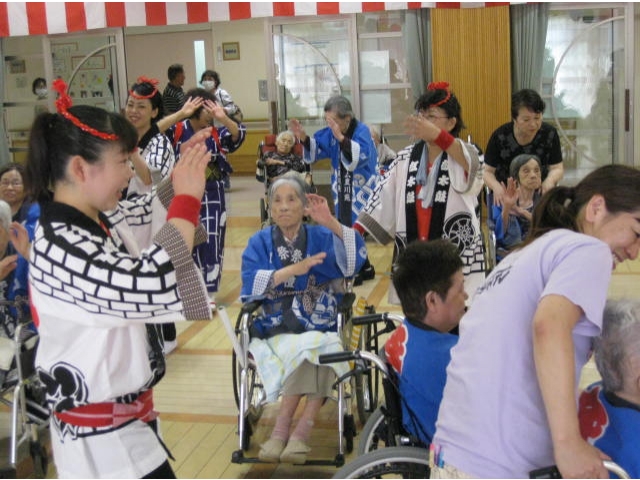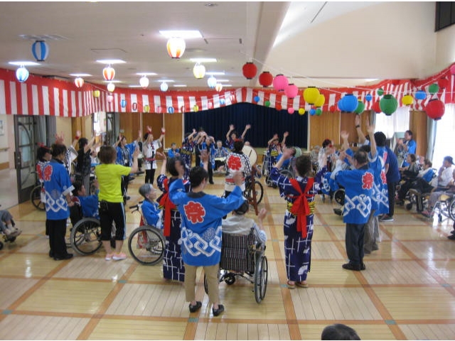 盆踊りは、大きな輪を作り全員で豊川音頭やサザエさんなどの曲を踊り楽しい時間を過ごす事が出来ました。