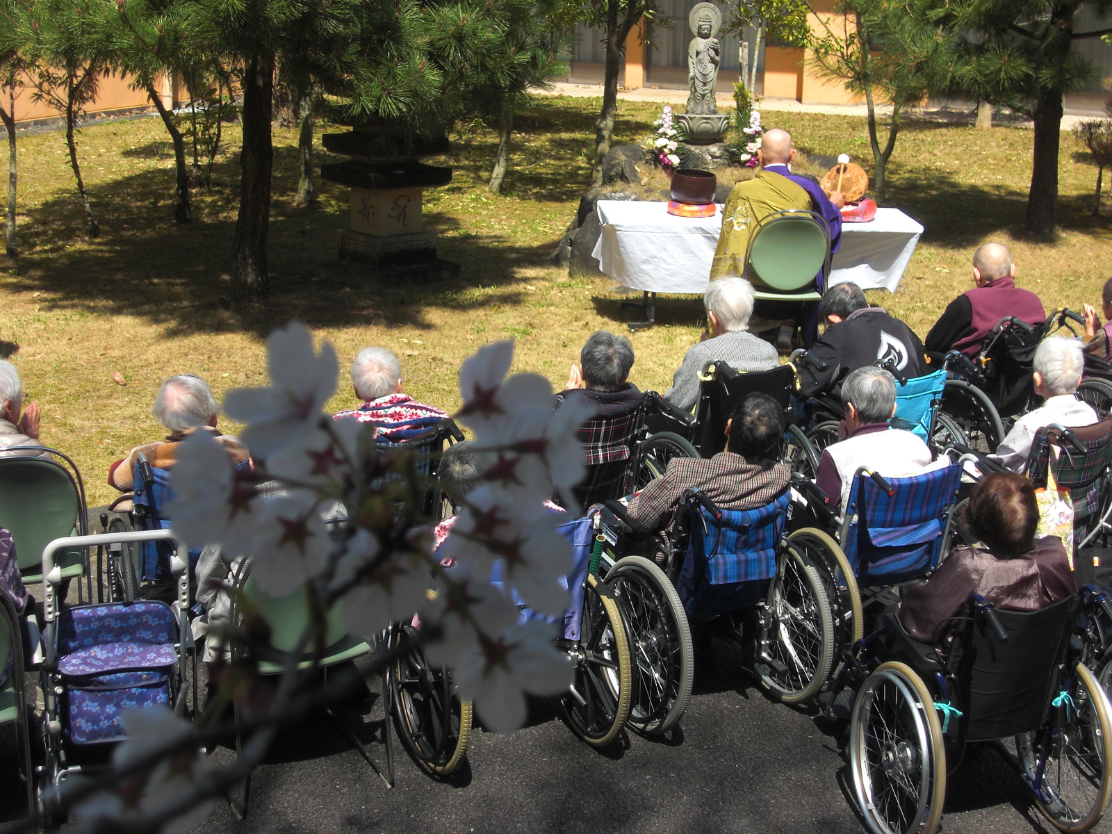 平成31年4月5日(金) 春らしい陽気の日、愛厚ホーム豊川苑では延寿観音供養祭を実施しました。 延寿観音様は豊川苑の中庭に祀られており、利用者さまの心のよりどころとなっています。 開所以来お世話になっている清海寺老僧の読経により、豊川苑の物故者を利用者さまと職員でお参りしました。 参加された方々が、また来年もこの場所でお参りが出来るよう、延寿観音様にお願いをしました。
