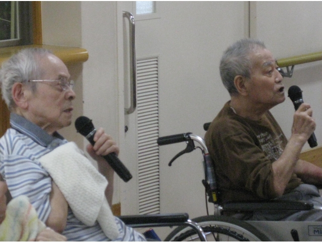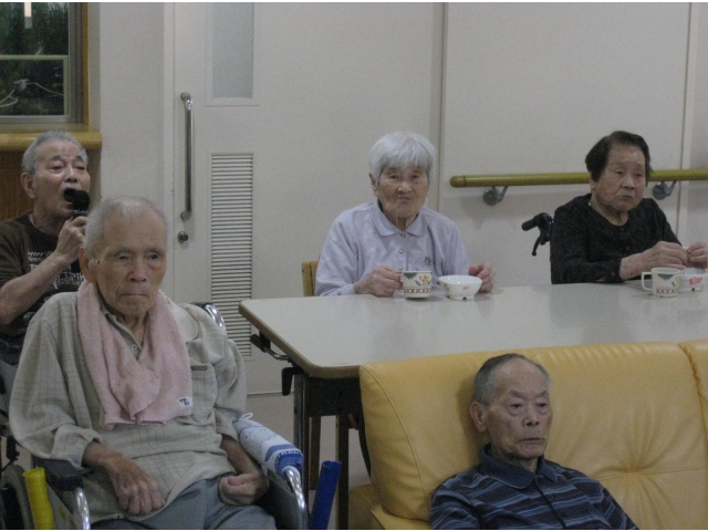 ある日曜日の午後3時、2階の利用者様が談話室に集まり、おやつとジュースを食べながらカラオケ大会が始まりました。