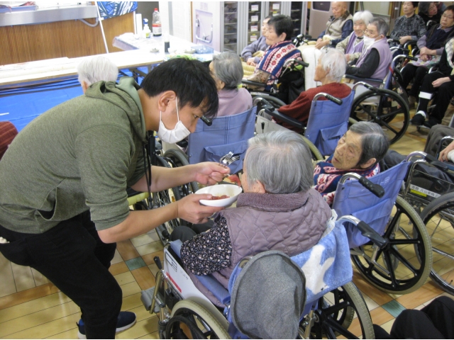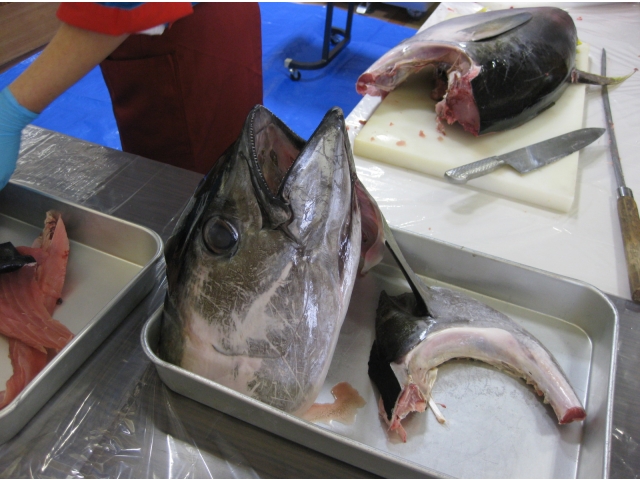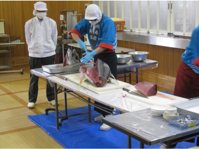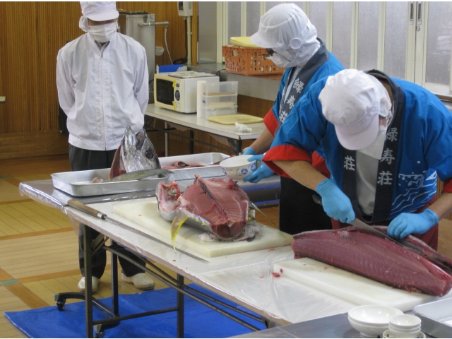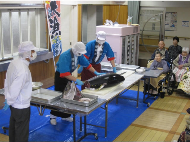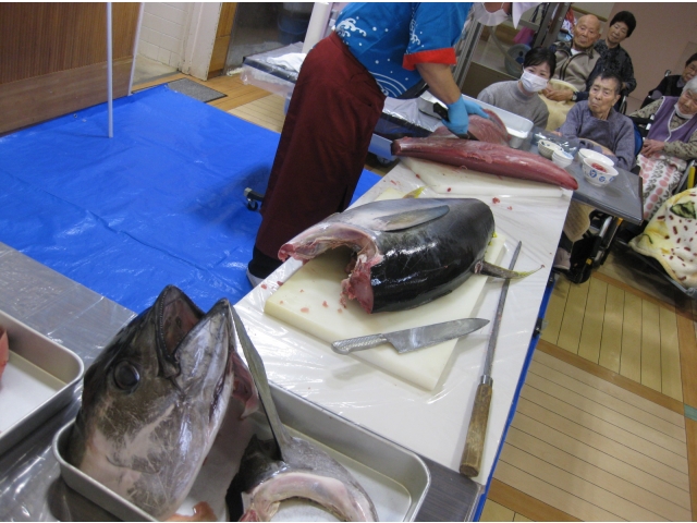 食事は利用者様にとって楽しみのひとつ。季節によって旬の食材を楽しむことも、豊川苑では出来ます!今日は調理師さんのご協力によりまぐろの解体ショーを行いました。本日のまぐろは40kgのキハダマグロ。約200人分の刺身が取れるとか。「私よりも重たいじゃん。」「こんな大きなの見た事ないわ。」と皆さま大興奮!