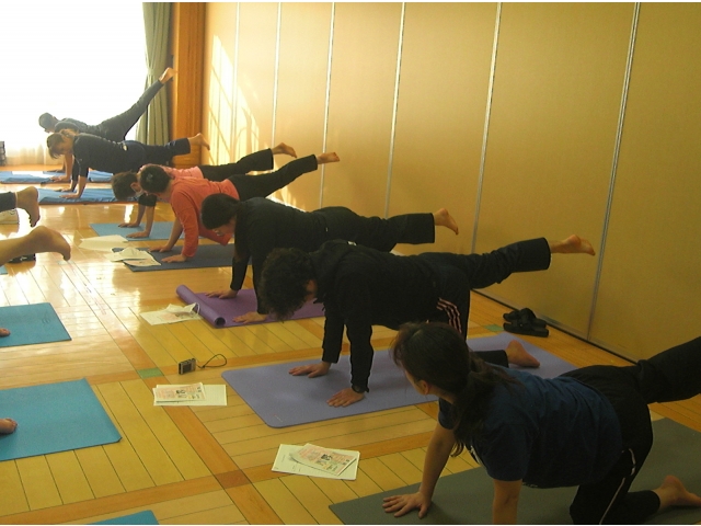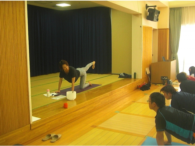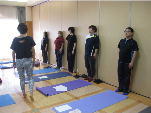 腰痛予防に効果的なポーズをいくつか体験し、普段使わない筋肉を伸ばしたりするため、身体が固い?職員からは悲鳴が…