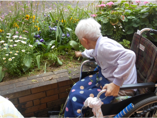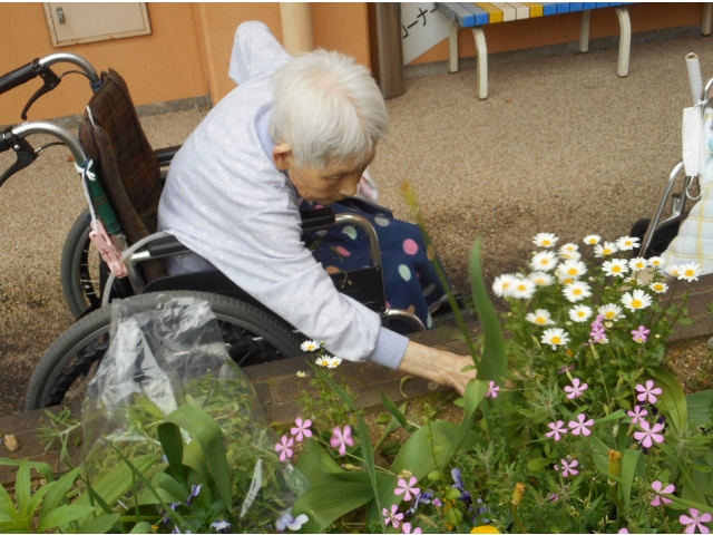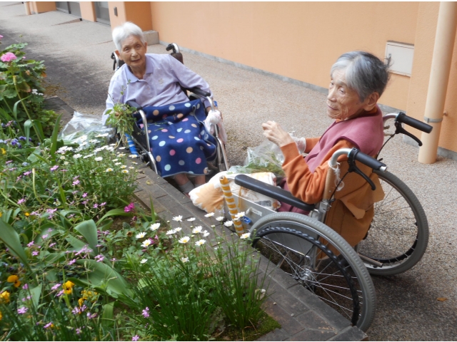 5月に入って暖かくなってきたことで、中庭の一角の花壇に花や雑草がたくさん生えてきました。利用者様に「花壇のお手入れをしませんか?」と誘うと「やるよ!」と言って頂きました。花壇に生えている雑草をドンドン抜いてもらえて、あっという間にキレイになりました。お手入れが終わると「百姓の娘だで、いつでもやるよ」と笑顔で言ってくれました。
