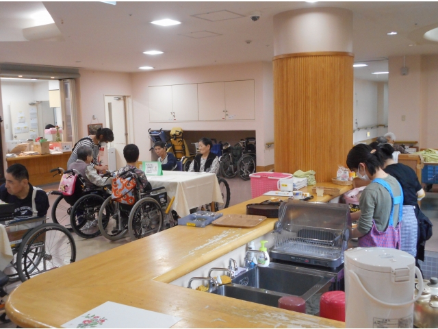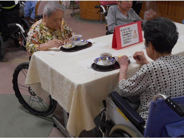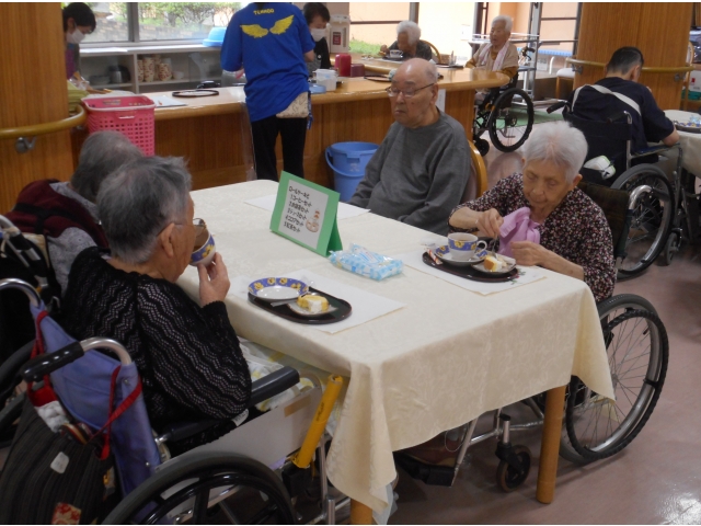 喫茶が開かれる日の朝、普段は居室で過ごされている利用者様も、デイルームで何時始まるかと待ちわびている姿がありました。本日のお茶菓子は、希全の里の中にある「夢風船」のロールケーキです。「これ美味しいなー」と言って召し上がっていました。飲み物は抹茶やジュース等がありましたが、温かいコーヒーを飲まれた方が一番多かったです。