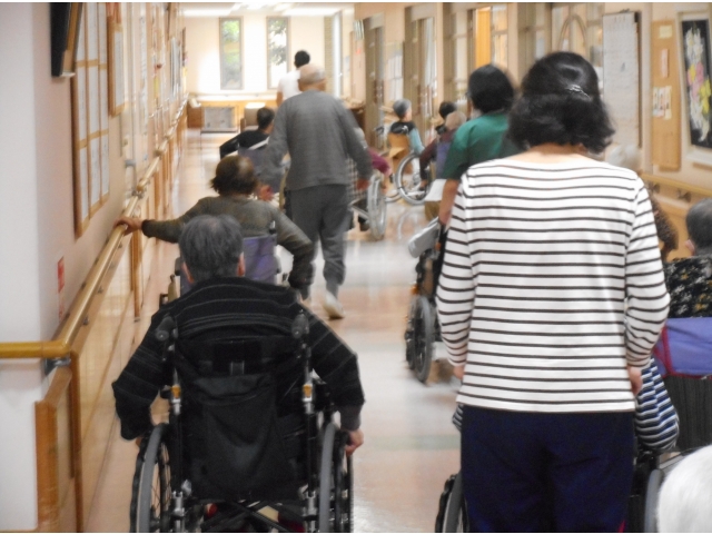 豊川苑の北側から土砂崩れが起こったという想定の防災訓練を行いました。各階の北側に面する居室の利用者様を対象に1階の食堂まで避難訓練をしました。放送で「避難して下さい」と言うと、職員の誘導に従って食堂まで行きました。訓練を繰り返し行うことで、利用者様も職員も災害が起こった時に適切な行動が取れると思います。大きなトラブルもなく、無事に防災訓練が終わりました。