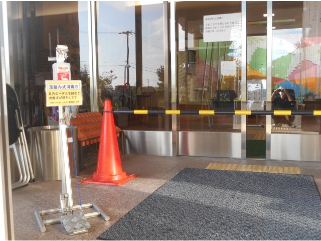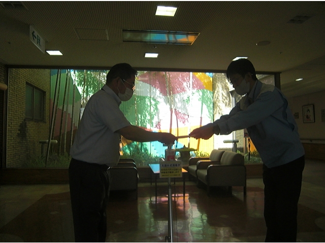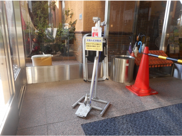 取り扱い方法の説明を受けました。足で踏むと適量の消毒液が噴霧されます。正面玄関に設置し、施設を出入りする関係者が使用していきます。