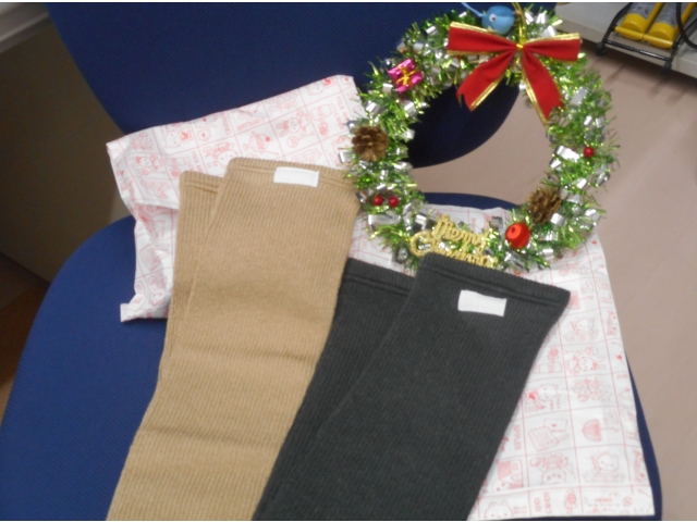 まず初めに、サンタの恰好をした苑長から、各階の代表者にクリスマスプレゼントが渡されました。プレゼントの中身は、レッグウォーマーです。