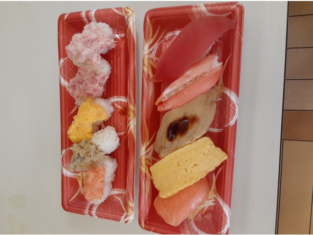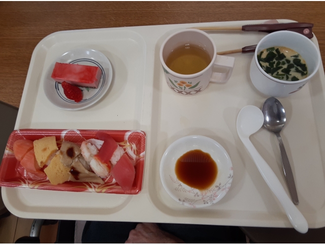 昼食にはお寿司が振舞われ、ネタは、まぐろ、サーモン、タマゴ、カニ、アナゴです。おかずは茶わん蒸しとイチゴのデザートが付き、とても豪華な食事となりました。皆さん喜んで頂けて嬉しい限りです。