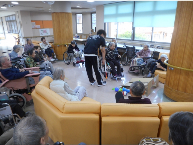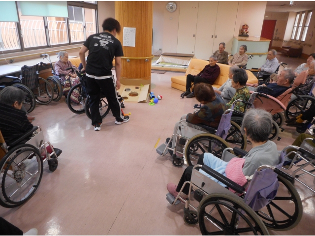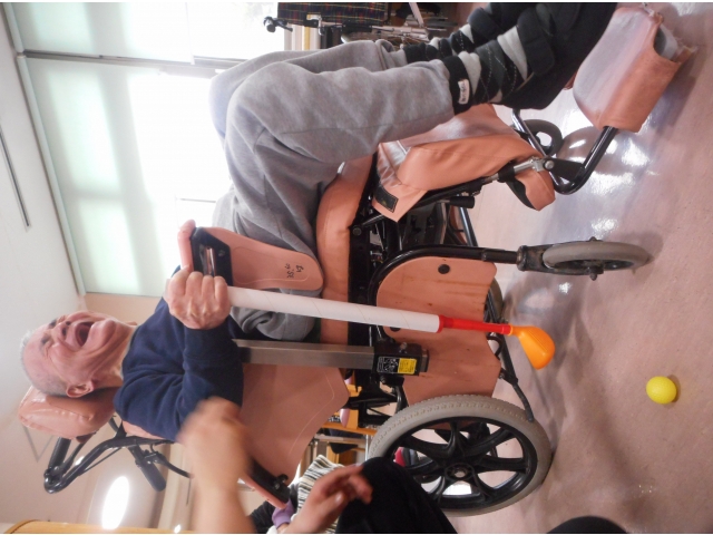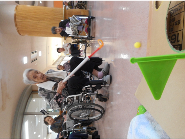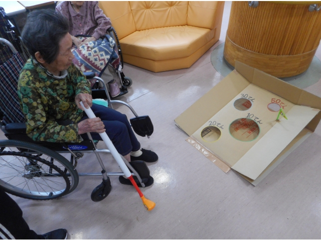 レクリエーション活動としてゴルフ大会を開催しました。最初は「私は下手だから見てるだけでいい」と言われる利用者様が多かったですが、やっている姿を見て「やってみようかな」と言う利用者様が多く、1球1球に一喜一憂されておりました。