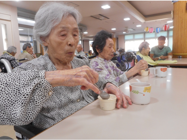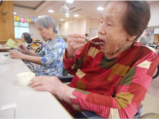 みんなで声を掛け合ってスイカ割りを行い、割ったスイカはデザートとして食べました。とても甘くみなさまも「おいしかったね」と笑顔が見られました。