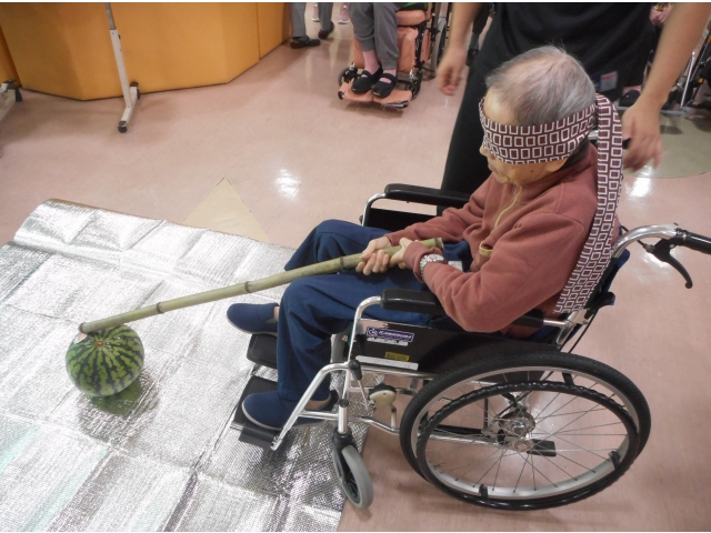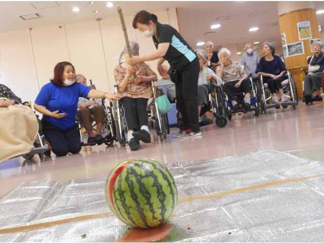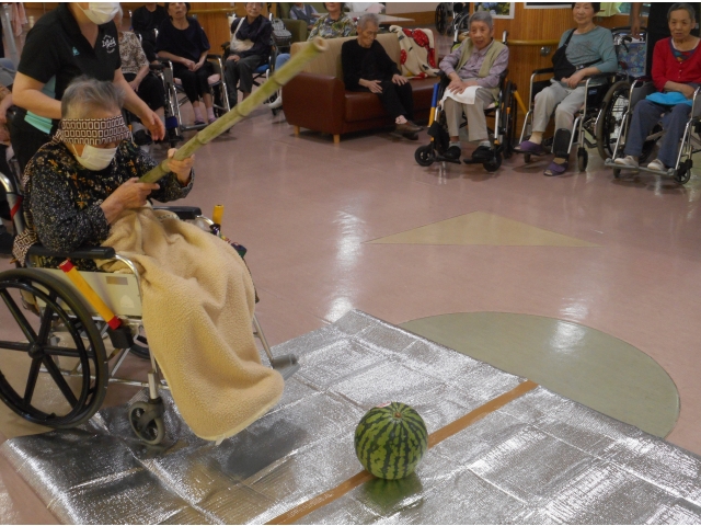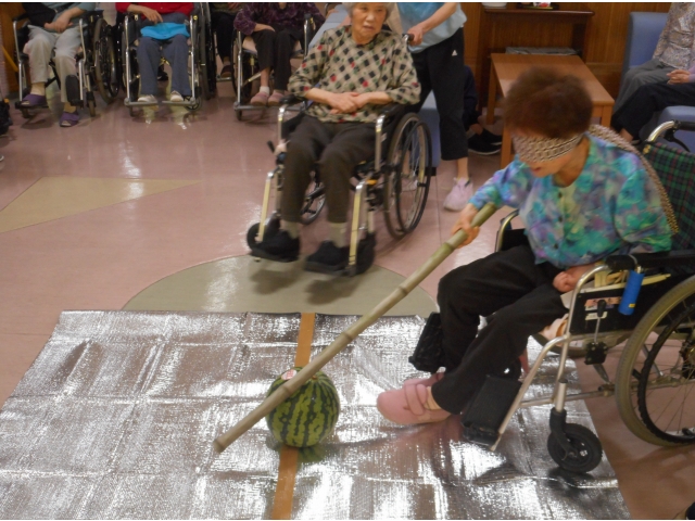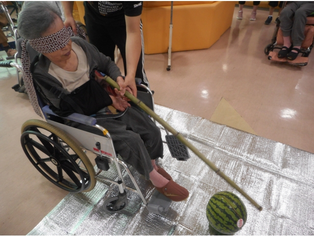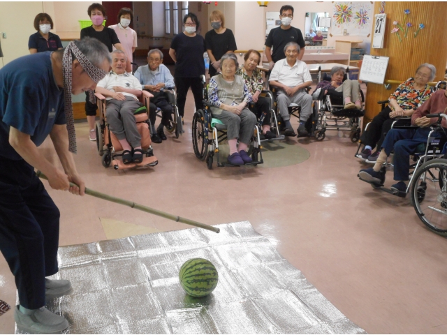 今年の豊川苑では夏を少しでも感じて頂けるように、室内でスイカ割りを行いました。