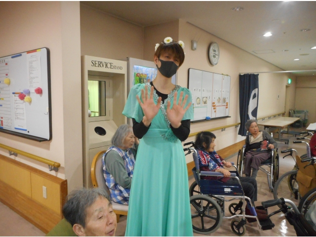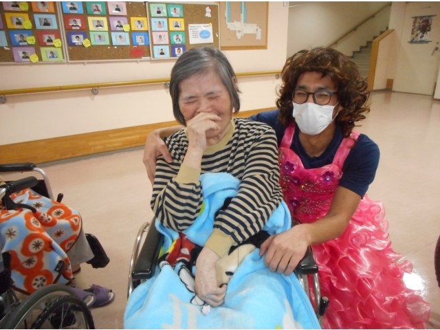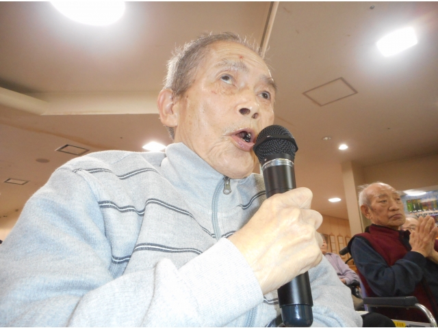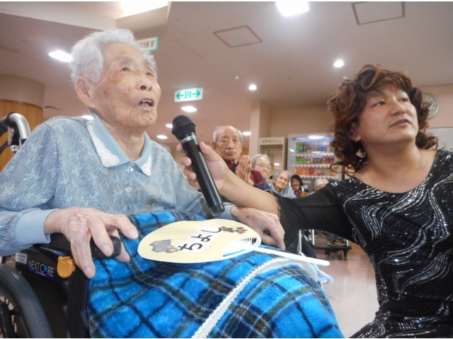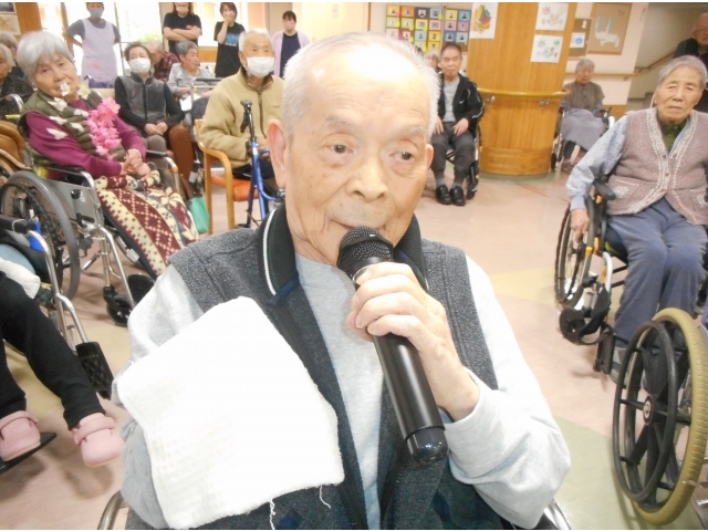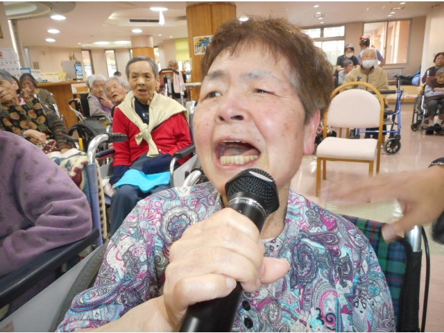 豊川苑では11月にカラオケ大会を開催しております。利用者様も毎週あるカラオケクラブでの練習を、この大会でばっちりと披露して頂いております。普段は、カラオケクラブでは恥ずかしがって遠慮してしまう利用者様も「せっかくだから歌ってみようかな」と積極的に参加しております。職員は会場を盛り上げる為に仮装を行いました。所々で笑顔が見られる時間を過ごす事が出来ました。