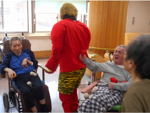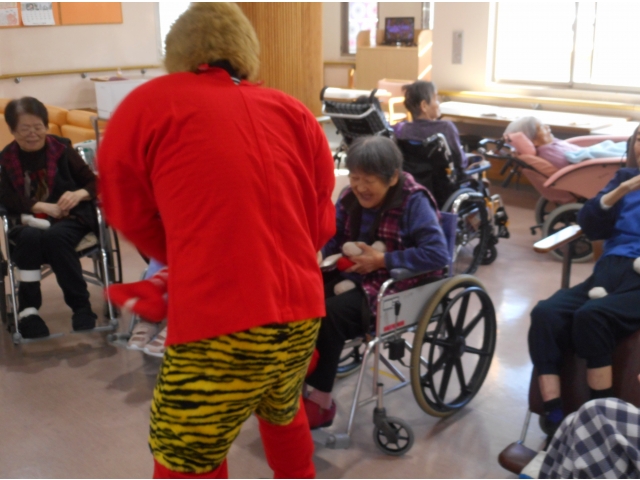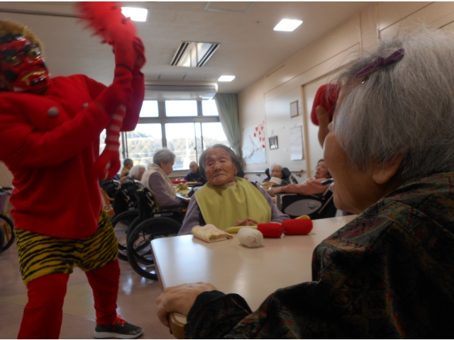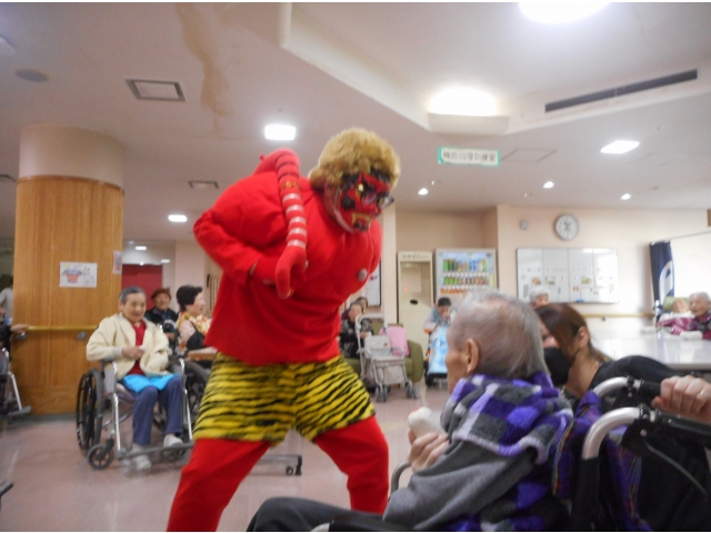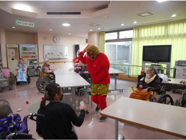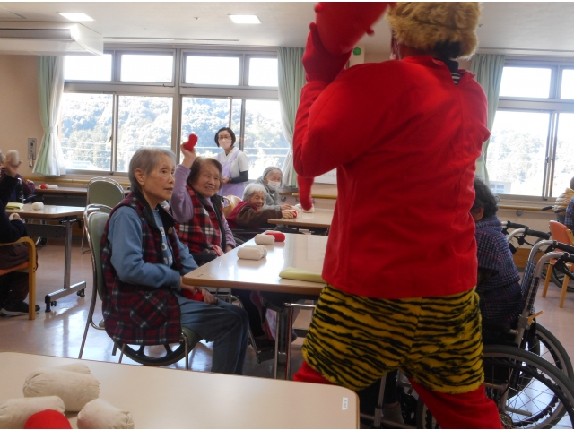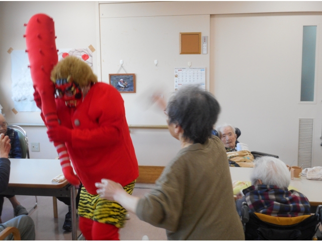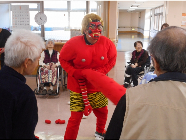 節分と言えば豆まきですね。豊川苑にも鬼がやってきました!利用者様には持ちやすい為に、豆の代わりに紅白お手玉を使っております。鬼に玉を当てて「やった、当たった」と笑顔で言う利用者様もいれば、落ちている玉を拾って逆に鬼を追いかける利用者様もいました。利用者様の頑張りがあり、豊川苑の鬼も無事に追い出すことが出来ました。今年も鬼(悪いもの)を追い出して福(いい事)が皆様のもとに来ると良いですね。