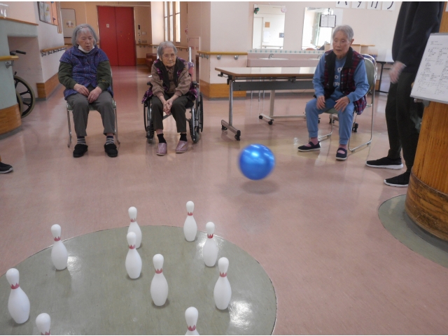 豊川苑では余暇時間にボーリングやゴルフなど軽く体を動かすことが出来るレクを行っておりますが、今回は、オリンピックみたいにボーリング大会を開催しました。