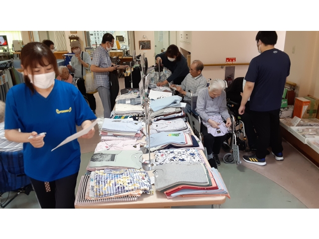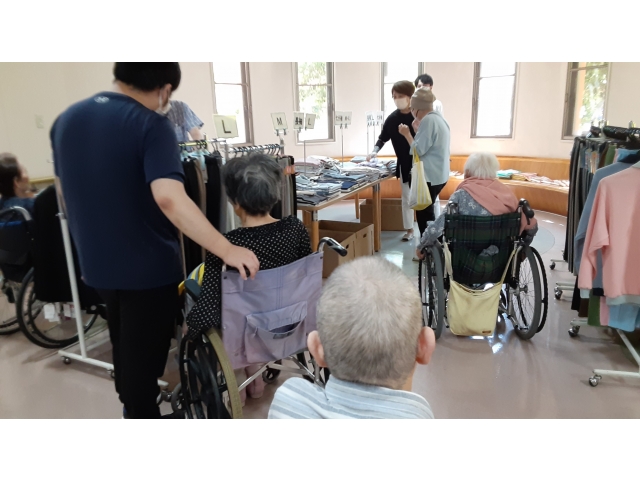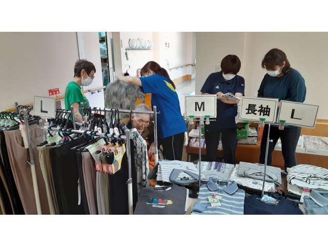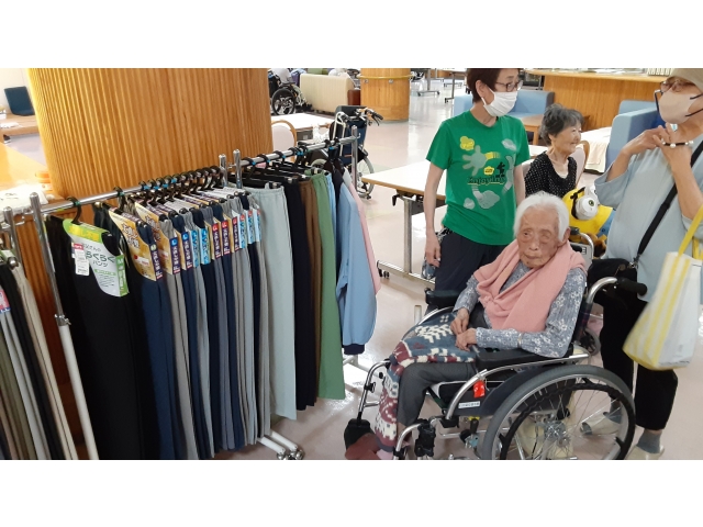 6月19日当施設内で衣類販売が行われました。開始前から入所者様が周りに集まっており楽しみに待っていた様子!服を選んでいる時の表情はとても真剣でした!!服は後日届くので、「早く届くと良いね~」と話しながら選んだ服が到着するのを心待ちにしていました。皆さん気に入った服が見つかったようで良かったです。