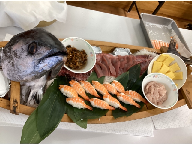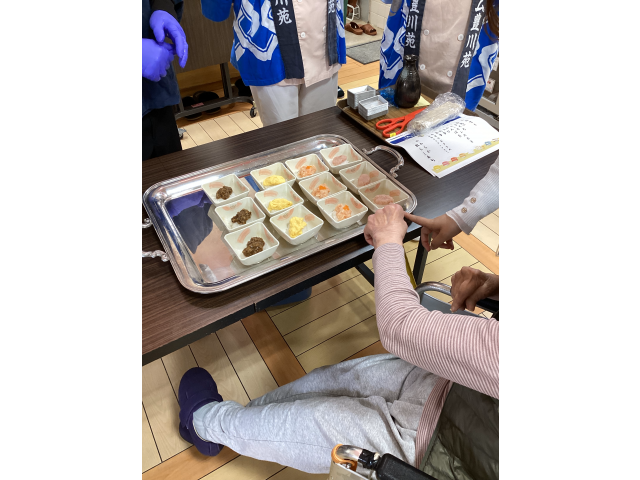 先日ソシオフードサービス㈱のご協力のもと寿司祭りを行いました。皆さん献立表の寿司というキーワードにそわそわ…わくわく…されていました。追加注文OK、やわらかいお寿司もあり、満足いくまでお寿司を召し上がっていただきました。毎年恒例になりつつありますが、今年も食堂にカラオケ機器をスタンバイ♪寿司職人さんたちの歌声が食堂内に響き渡りより一層美味しく楽しい時間となりました。