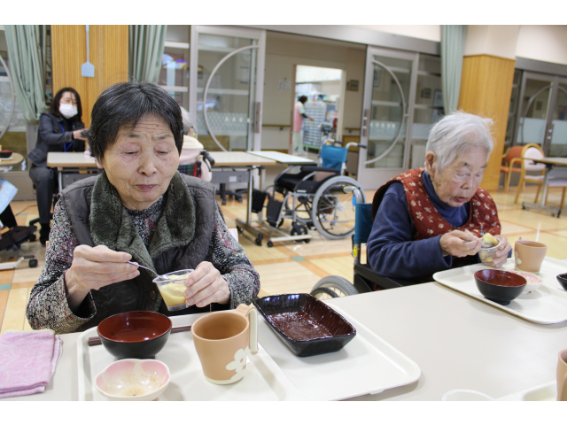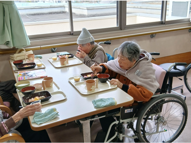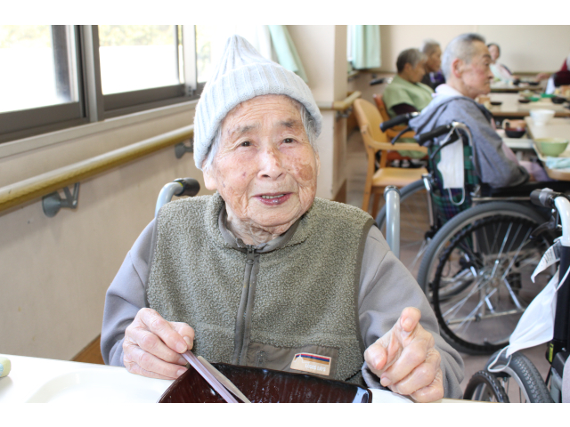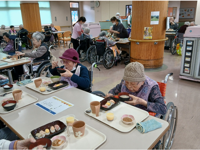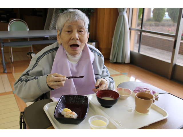 当施設では、年に1度の特別行事として「寿司まつり」を開催しました。ご用意したのは、まぐろや玉子、えび、などなど。皆さんが食べやすいように刻むなど配慮したお寿司となっています。お寿司を前にすると、皆さま自然と笑顔に。おかわりも出来るため、好きなだけ食べて、皆さんご満悦な表情でした。