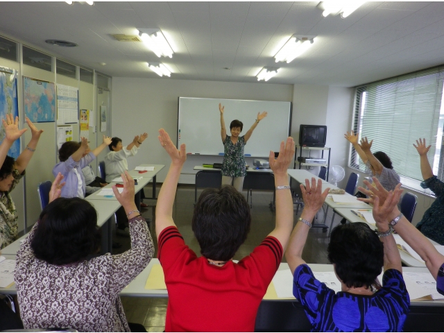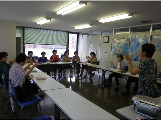 4月講座は「幸せなら手をたたこう」「上を向いて歩こう」「むすんでひらいて」等から始まりました。多くの日本人にとっては決して難しい歌ではありませんが、中国語を母語とする帰国者にとっては、例え童謡であってもとても難しいのです。