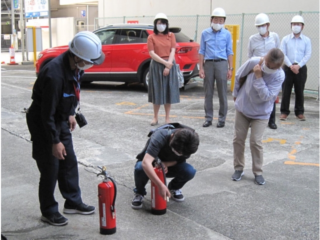 続いて、消火訓練。水を充填した訓練用消火器から、火元に見なした赤い三角コーン目がけて放水。受講者も交代で操作を体験しました。
