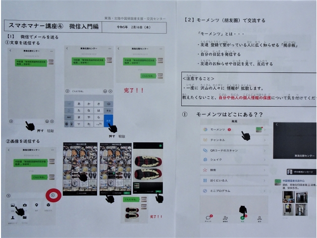 文章の入力・送信、写真等画像の編集・送信などの基本的機能から始め、その後、つながりのある人の投稿を閲覧したり、自ら投稿をシェアできる機能である「朋友圏(モーメンツ)」の利用方法を学びました。