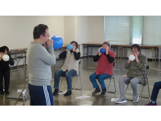 続いて、コップの中の水にストローで息を20秒間吐き続ける練習。さらには、ゴム風船を一気に膨らませる運動。童心に帰り、遊び感覚で楽しめました。