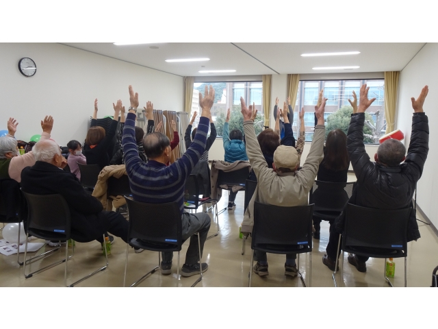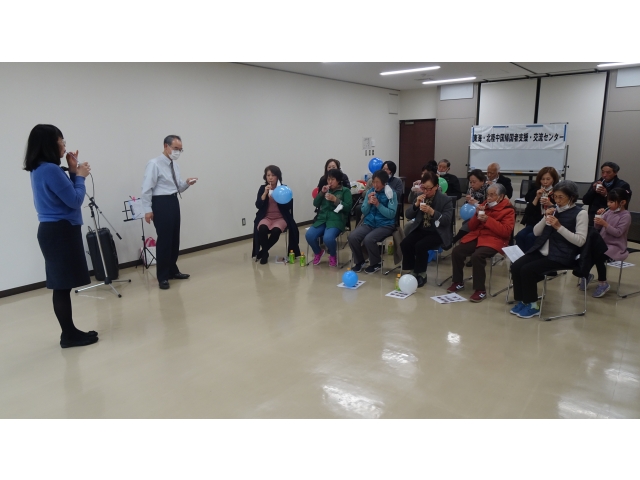 所長挨拶の後、まずは、高齢者に多い誤嚥が原因の肺炎を予防するための「誤嚥体操」。風船を膨らませたり、コップ・水・ストローを使って息を吹き続ける練習などで、肺と喉を鍛えました。