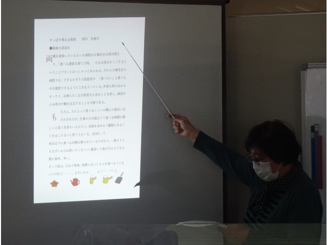 パソコン教室では、「写真・イラストを組み込んだワード文書」「アニメーションを多用したパワーポイント・スライドショー」など、学習の積み重ねがよくわかる見事な作品がスクリーンに映し出され、見学者からは驚きの声と拍手があがりました。