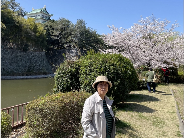 地下鉄「名古屋城」駅で集合した後、満開の桜を愛でながらゆらゆらと歩いて名城公園へ。青空に映える名古屋城と桜をバックに集合写真を撮りました。