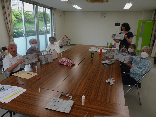 次は、新聞紙2枚を使った「新聞エコバッグ」作り。センター職員が1工程ずつ説明・実演し、帰国者各自が作っていきます。参加者全員が高齢のため、「ゆっくり」と声かけし、1時間半ほどで全員が自分のバッグを完成させることができました。