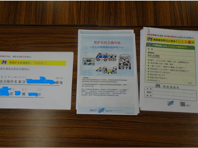 所長挨拶の後、まず、総務省消防庁作成資料「救急車の正しい呼び方」中国語版等を使って、救急出動が必要な病状や出動要請方法等を説明しました。