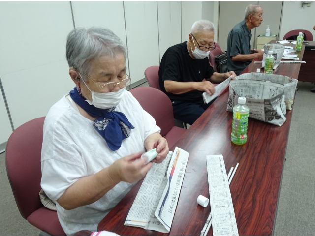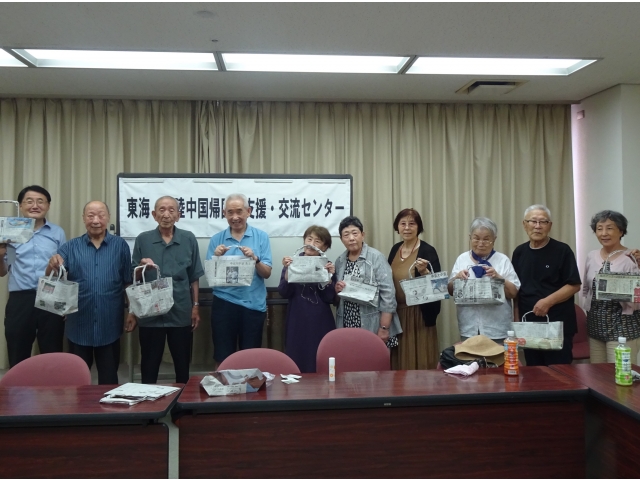 次は、新聞紙2枚を使った「新聞エコバッグ」作り。センター職員が1工程ずつ説明・実演し、帰国者各自が作っていきます。1時間ほどで全員が自分のバッグを完成させることができました。