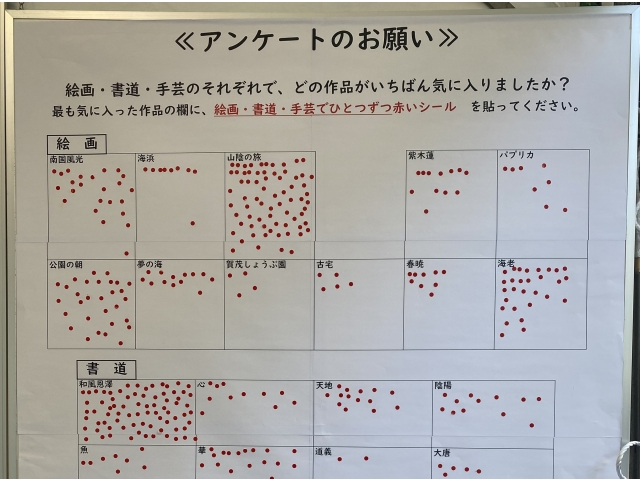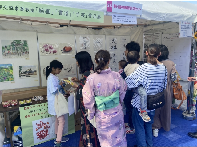 ブースでは、当センターの定期交流事業教室(絵画、書道、手芸)の作品を展示し、気に入った作品を選ぶアンケートを実施。参加者には、中国帰国者についての新聞記事のコピーを巻き込んだ来年の剪紙絵柄ポスターカレンダーを差し上げました。また、「中国残留邦人・中国帰国者とは?」などのリーフレットを配布し、当センターの事業を紹介するパネル・映像を展示・上映しました。