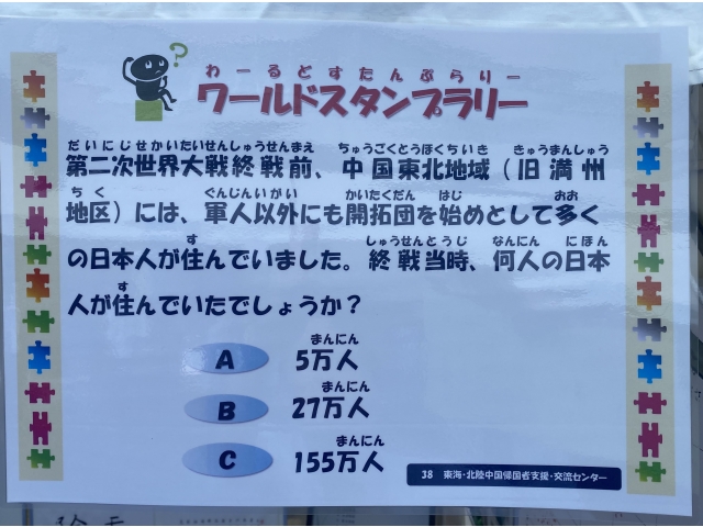 合わせて、主催者実施の「クイズラリー」では、終戦時の在満州日本人数を問うクイズも行いました。「155万人」との正解を聞いて、ほとんどの方が「そんなにいたんですか!」と驚きの声を上げていました。