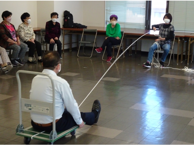最初に講師から、「身体を動かさない」ことに起因する生活の悪循環の説明を受け、障害者支援施設での活動状況を学んだ後、前半は「引っ張るレクトレ」。ひもを両手で巻きながら空き箱を引き寄せるゲーム、人が乗った台車をロープで引っ張るゲームを、個人戦で楽しみました。