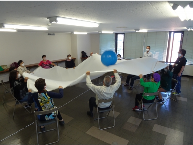 最後は、「腕と体幹を鍛えるレクトレ」。6人ずつ2チームに分かれ椅子に座って、大きな布を持ちます。そして、布の上に置いたボールを、腕を