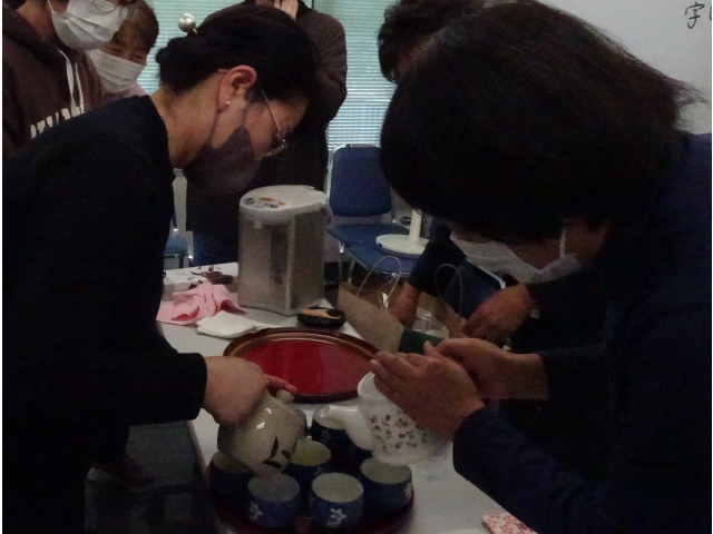 前回学んだ、事務所、応接室、エレベーターのそれぞれでの「上座」「下座」について復習したあと、来客へのお茶・お菓子の出し方を学びました。用意された日本茶と和菓子を用いて、講師が実演する模範的な所作にならって、各参加者が、お茶の淹れ方、お盆への載せ方、テーブルへの置き方などの実習を行いました。