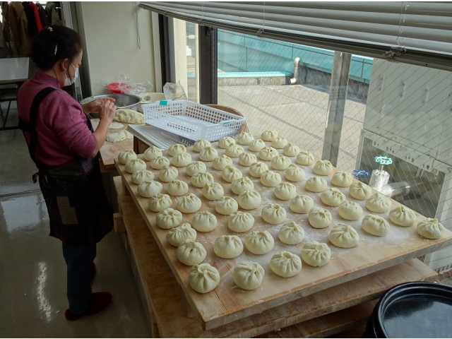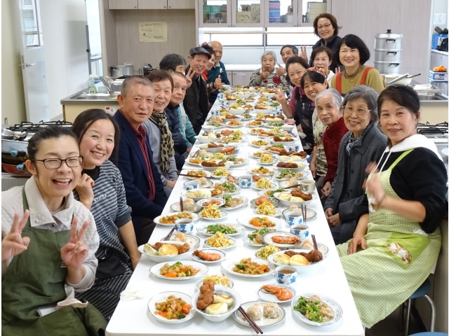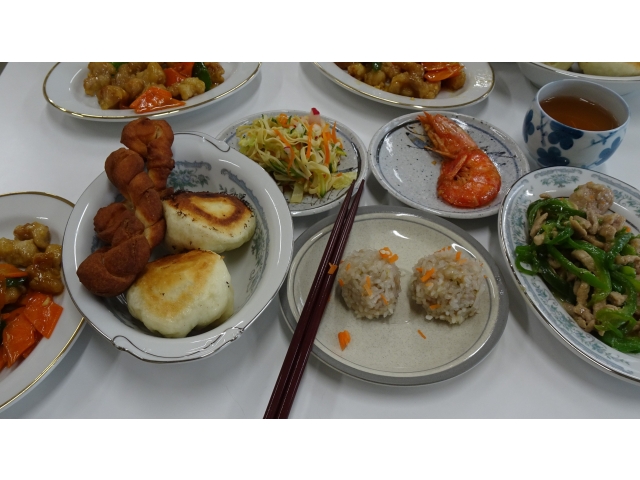 参加者は帰国者1世とその子ら18人。2世の料理腕自慢が手分けして、9品の料理を作りました。麻花(ねじった形の揚菓子)や水煎包(焼肉まん)の生地作りは、前日からという熱の入れよう。「1世の喜ぶ顔が見たい」という思いからとのことでした。