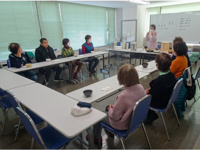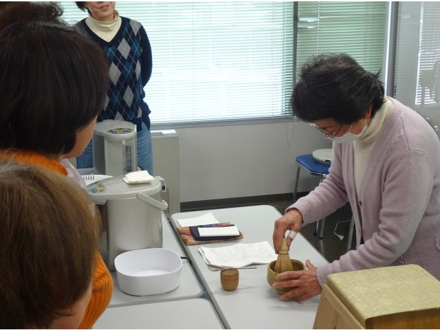 1月25日(木)、日本語で学びながら楽しく交流する新企画、「楽楽サロン」第1回を開催しました。今回は「気軽に抹茶を楽しむ」と題して、渥美栄先生から基本的な茶道の作法を学び、抹茶を楽しみました。参加者は8人でした。