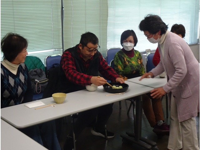 最初に、抹茶の健康への効用、茶道具の名前などを学んだあと、さっそく和菓子で実習スタート。懐紙・黒文字を使って、初春のたより「うぐいす餅」をいただきました。
