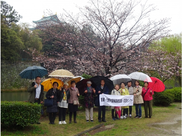 迎えた当日3日は、快晴の前日とは打って変わって、小雨が降り続くあいにくの天気。地下鉄「名古屋城」駅で集合した後、ゆらゆらと歩いて名城公園へ。名古屋城と桜をバックに、集合写真を撮りました。