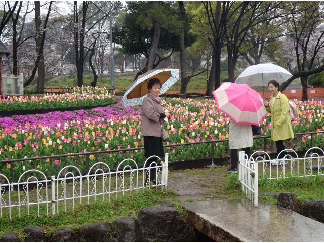 公園内では、オランダ風車の前でピンク・黄・白のチューリップが花盛り。ニオイアラセイトウなども咲き誇っていました。人出が少なく、ゆったりと花を眺めることができました。