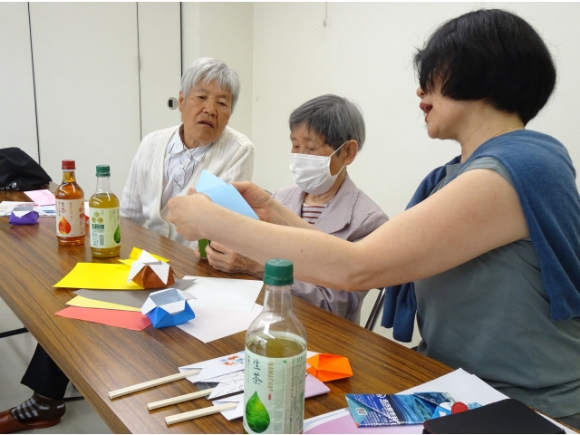 次は、折り紙。一つ目は、これからの季節に合った「あじさい」「金魚」の絵柄の紙を折って、箸袋を作りました。職員が日本の正月での祝い箸の風習を説明すると、中国と日本での正月の食べ物の違いなどについての話で盛り上がりました。
