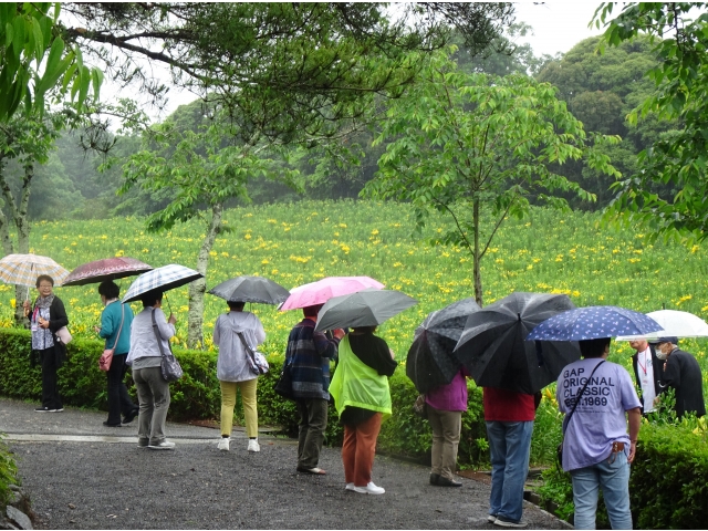 今年は雨の日が多く日照時間が足りないためユリの開花が遅れぎみで、また、あいにくの雨模様のため屋外での花の鑑賞には不便もありましたが、雨霞のなか広大なゆり畑で一面に咲く黄色いユリはたいへん美しく、カメラに収める参加者が多く見られました。