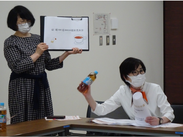 冒頭、猛暑が懸念される夏の入口にあたって、職員が熱中症対策方法についてクイズ形式で説明しました。その後、参加者が懐かしい中国の歌や「赤とんぼ」など日本の童謡を順に披露しました。大病から回復し久しぶりに交流会に来られた方も大きな声で歌われ、それに励まされてか、多くの方がかわりがわりに歌唱。中国の歌に合わせて踊る方もいらっしゃいました。