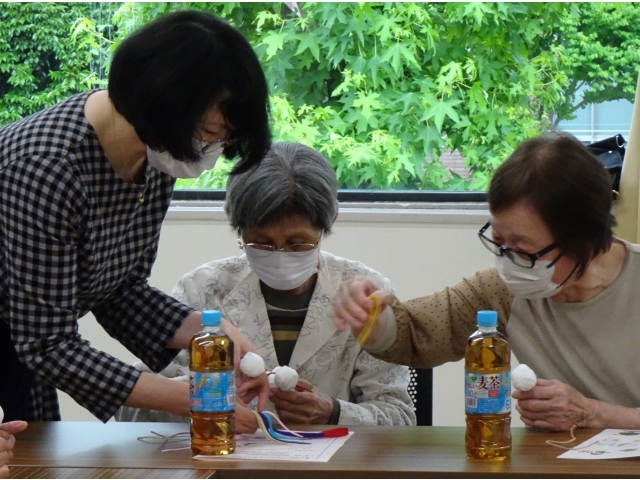 中国にも伝説上の女性をモチーフに晴れを願って作られる「掃晴娘」という剪紙(切り絵)の人形があり、それが日本に伝わって「てるてる坊主」になったという説があります。職員が用意したキッチンペーパーやリボンを使って、かわいらしい人形に仕上げることができました。