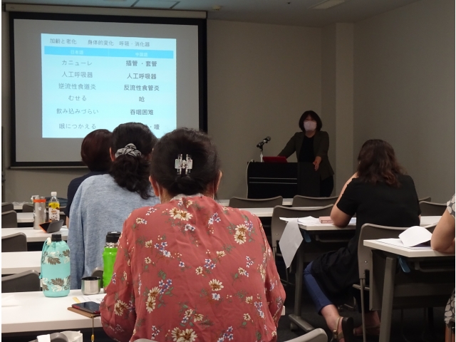 当センター所長の開講挨拶に続き講義が始まり、老化に伴い高齢者が発症しやすい疾患について、器官ごとに、病名、発症機序、予防法・治療法中国語訳病名などを、講義形式で学びました。