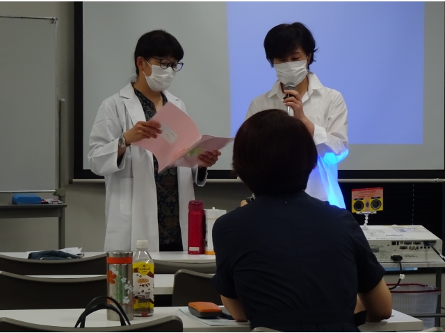 後半は、医療現場を想定したロールプレイ。医師役(日本語)と患者役(中国語)の間に入って、メモを取りながら、「頻尿を訴える患者の病状説明を医師に伝える」「医師からの病名・薬剤名及び服用法などの説明を患者に伝える」練習を行いました。