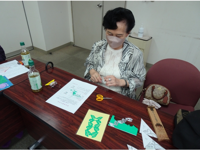 次は、中国の切り絵、「剪紙」。センター職員が持参した型紙を使って、色紙を手芸挟みで切っていきます。30分ほど黙々と取り組み、各参加者が