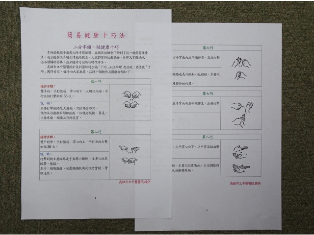 まずは、健康体操。中国本土で行われている、手のひらを使った「簡易健康十巧法」に皆で取組みました。形を変えながら左右の手を36回打ち鳴らすなど、簡単に取り組め、気分がよくなる動きです。ツボを刺激する効果の説明もあり「家事の合間などに、気楽にできるのがいいね」と好評でした。